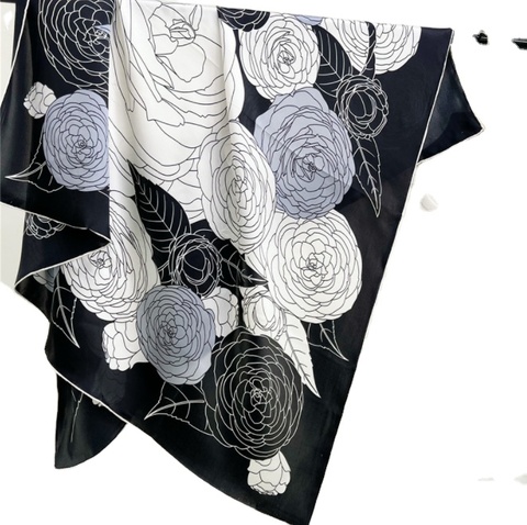 Mooie Camellia Design Zwarte En Witte Kleur Met Zachte Digitale Print Sjaal Luxe Satijnen Sjaal Voor Vrouwen